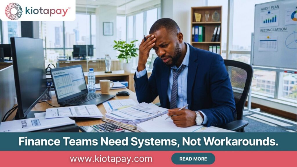 Day after day, finance teams find themselves juggling spreadsheets, patching together apps, and inventing manual systems just to keep operations running. It becomes normal to settle for workarounds until something breaks, a payment gets lost, or a quarter close turns into a nightmare. Why Workarounds Hurt More Than They Help Workarounds might feel like quick fixes, but they come with real costs: Lost time — Manually reconciling mismatched data eats hours that could be spent on strategy. Human error — Copying between systems increases mistakes, and one error can cascade into bigger problems. Limited visibility — Finance leaders struggle when data lives in different places, with no single truth to reference. Stress on teams — Constant firefighting burns out talent and distracts from impactful work. Put simply: Workarounds keep finance teams in reactive mode. What Finance Teams Really Need Modern finance thrives on clarity, efficiency, and control. Teams need systems not band aids that automate workflows, centralize data, and provide real-time insights. A proper system frees professionals to do what they were meant to do: drive smarter decisions, not track down missing numbers. That’s where a reliable payments ecosystem can make a difference. A strong foundation allows teams to: Track transactions in real time Automate reconciliation Improve reporting accuracy Scale operations without added stress Stop Juggling Problems Start Solving Them If you’re tired of temporary fixes and inconsistent processes, it’s time to adopt systems built for the financial challenges of today and tomorrow. kiotapay is designed to help finance teams move away from patchwork procedures and toward smarter, safer, scalable systems. Whether you’re managing collections, reconciling payments, or needing real time visibility, kiotapay brings it all together in one intuitive platform. 👉 Take control of your financial workflows today explore how kiotapay can transform your team at: https://kiotapay.co.ke/